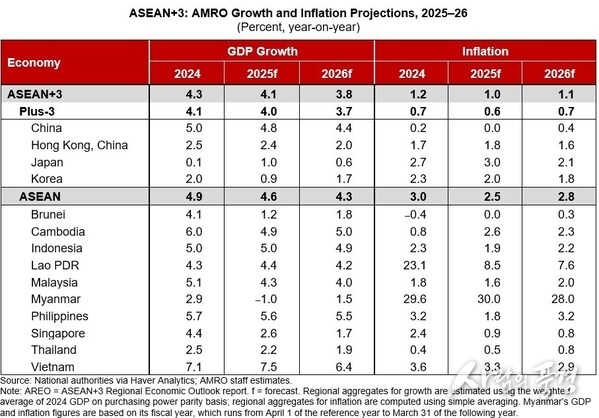 아세안+3 지역의 경제성장률은 2025년 4.1%, 2026년 3.8%로 전망되며, 이는 상반기의 견조한 성장 실적과 예상보다 강한 수출 모멘텀에 힘입어 7월 전망치에서 상향 조정된 것이다. '해방의 날 (Liberation Day)' 관세 발표 이후 4월에 정점에 달했던 시장 압력도 점차 완화되고 있다.