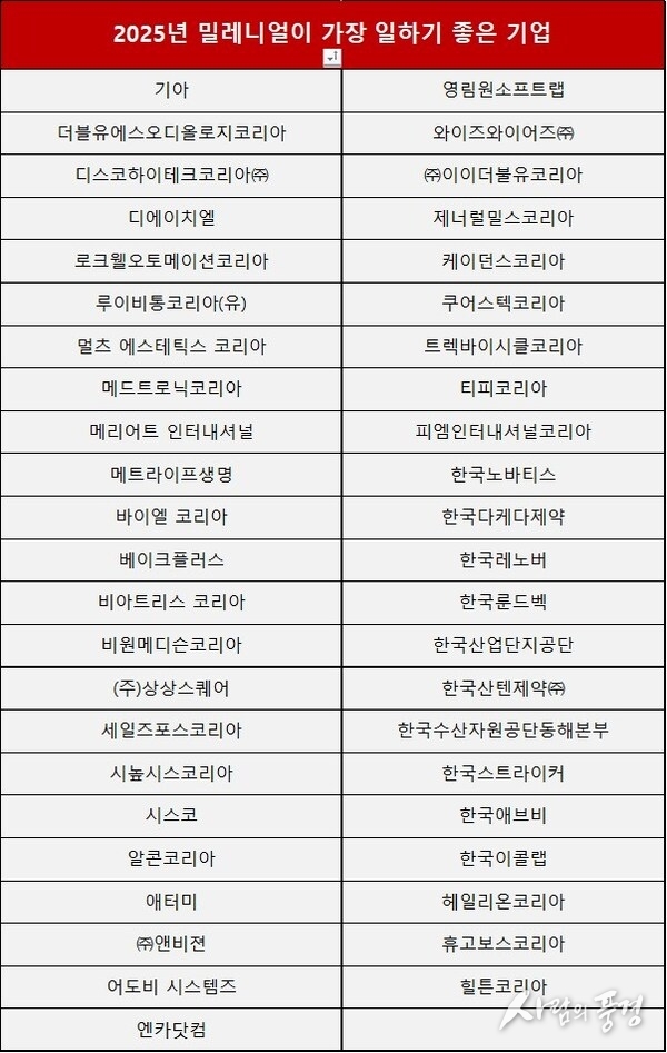 서울, 한국 2025년 11월 19일 -- 글로벌 신뢰경영 평가 기관인 미국 GPTW(Great Place To Work® Institute)가 주관하고 GPTW코리아(대표 지방근)가 주최하는 2025년 '대한민국 밀레니얼이 가장 일하기 좋은 기업'이 발표됐다.