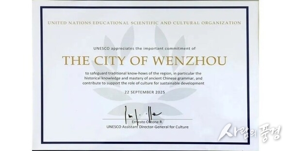 (사람의 풍경 peopleview 피플뉴스) 베이징 2025년 11월 30일 -- 중국 저장성 동부 소재 원저우시가 최근 문화유산 보존과 문화, 관광의 결합, 문화를 통한 지속 가능한 발전이라는 실질적 성과를 인정받아 유네스코로부터 연이어 표창을 받았다.