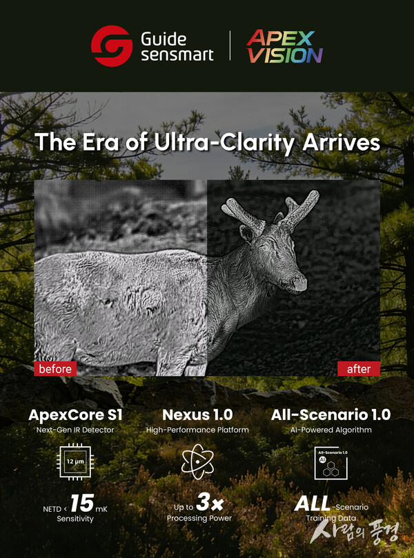 (사람의 풍경 peopleview 피플뉴스) 라스베이거스 2026년 1월11일 -- 열화상 기술 분야의 글로벌 선도기업 가이드 센스마트(Guide Sensmart)(센트럴 홀, 21740번 부스)가 차세대 열화상 혁신 기술 ApexVision의 공식 출시와 함께 해당 기술이 적용된 신제품 라인업을 함께 공개했다. 가이드 센스마트는 이번 출시를 계기로 단순한 '열 탐지' 단계에서 '선명하고, 정밀하고, 지능적인 탐지' 단계로 이어지는 산업 전반의 도약과 더불어, 울트라 클라리티(Ultra-Clarity)로 정의되는 새로운 시대의 개막을 알렸다