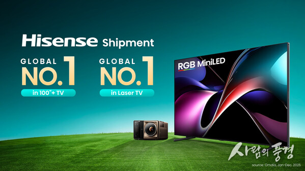 (사람의 풍경 peopleview 피플뉴스) 칭다오, 중국 2026년 3월 3일 -- 글로벌 소비자 가전 및 가전 분야의 선도 브랜드 하이센스(Hisense)가 글로벌 대형 스크린 TV 시장에서의 리더십을 재확인했다. 옴디아(Omdia)의 2025년 연간 글로벌 출하량 데이터에 따르면, 하이센스는 100인치 이상 TV 부문에서 2023년부터 2025년까지 3년 연속 세계 1위를 기록했으며, 2025년 글로벌 출하량 점유율은 57.1%에 달했다.